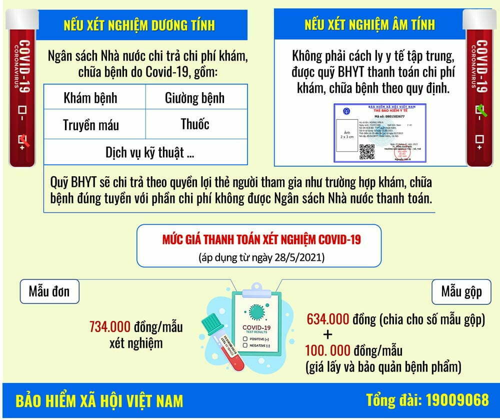 Nếu kết quả xét nghiệm là dương tính: Được ngân sách Nhà nước chi trả chi phí khám, chữa bệnh gồm: Khám bệnh, tiền giường, truyền máu, thuôc, vật tư y tế….(theo Mục 1 Công văn số 3100/BYT-BH ngày 20/4/2021 của Bộ Y tế )