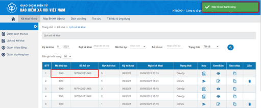 Sau khi nhập đúng mã PIN, hệ thống xuất hiện thông báo nộp hồ sơ thành công:
