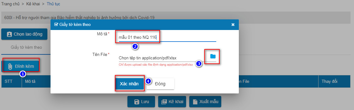 Bước 3. Tại màn hình chọn nút “Đính kèm”, sau đó thực hiện gửi kèm mẫu số 02 như hình sau và chọn Xác nhận: